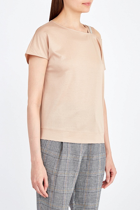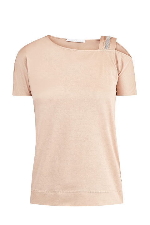 Футболка свободного силуэта от Fabiana Filippi выполнена в пудрово-розовом оттенке из хлопкового джерси. Модель асимметричного кроя с цельнокроеными короткими рукавами, один из которых дополнен широкой бретелью с атласной тесьмой и ювелирной вышивкой ручной работы. Детали: эластичная окантовка нижней кромки, вырез овальной формы. Сделано в Италии.