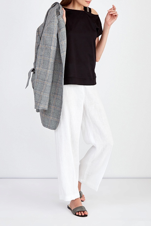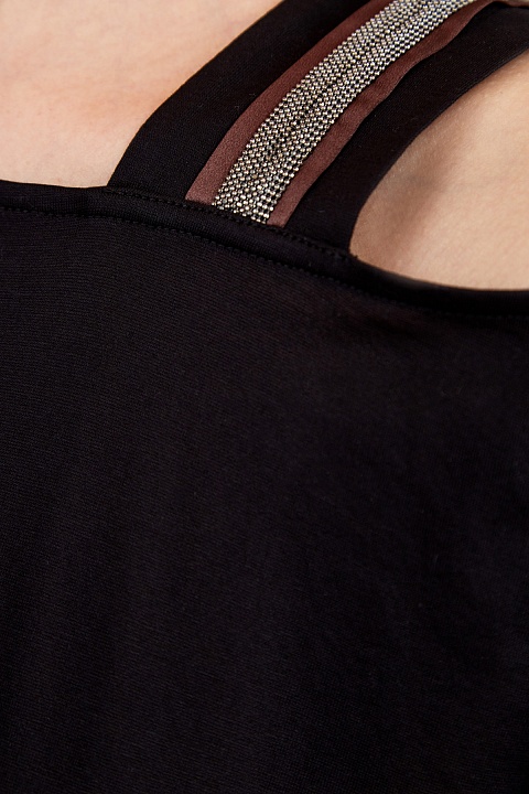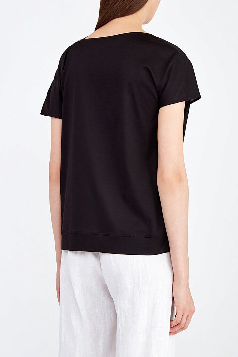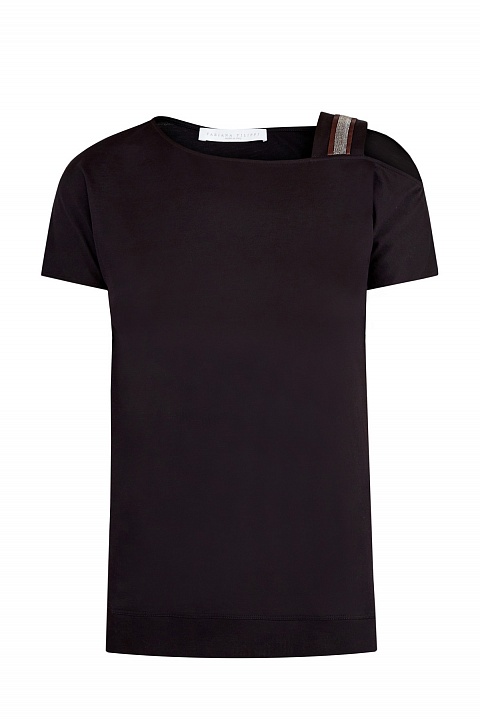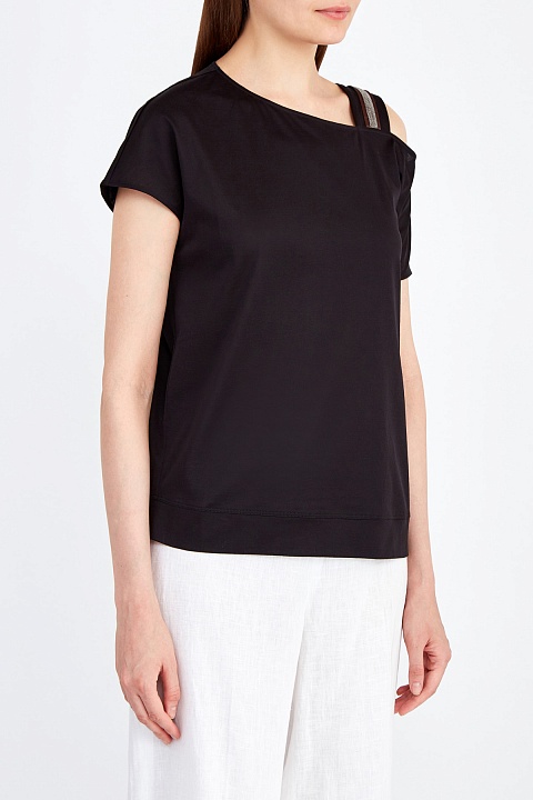 Футболка свободного силуэта от Fabiana Filippi выполнена из хлопкового джерси в черном цвете. Модель асимметричного кроя с цельнокроеными короткими рукавами, один из которых дополнен широкой бретелью с атласной тесьмой и ювелирной вышивкой ручной работы. Детали: эластичная окантовка нижней кромки, вырез овальной формы. Сделано в Италии.