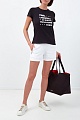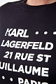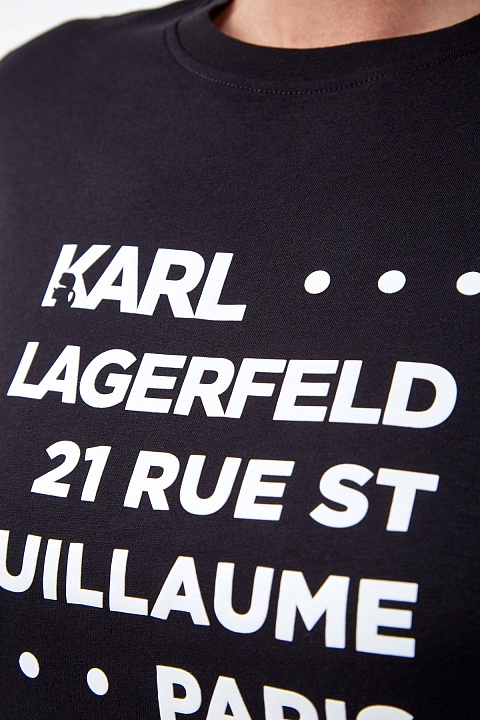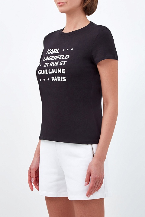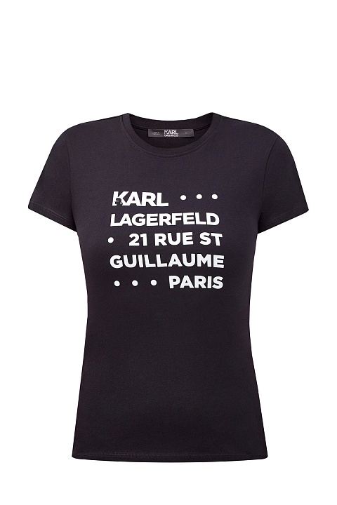 Лаконичная женская футболка-carryover из коллекции Karl Lagerfeld выполнена из эластичного хлопкового джерси в черном цвете. Модель приталенного кроя с круглым воротом и короткими рукавами украшена принтом с обозначением символики бренда и адресом бутика в Париже.