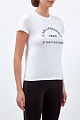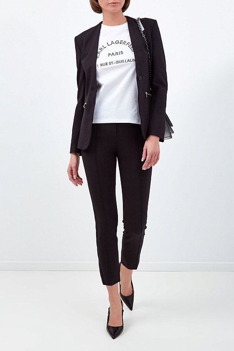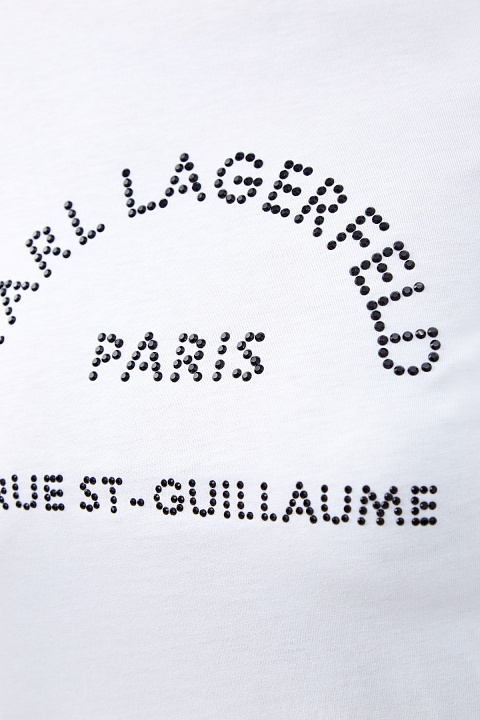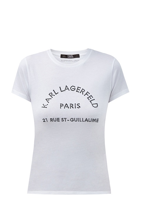 Лаконичная женская футболка-carryover из коллекции Karl Lagerfeld выполнена из эластичного хлопкового джерси в белом цвете. Модель приталенного кроя с круглым воротом и короткими рукавами. Передняя планка украшена контрастным принтом Rue St-Guillaume с обозначением символики бренда и адресом бутика в Париже.