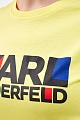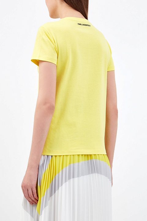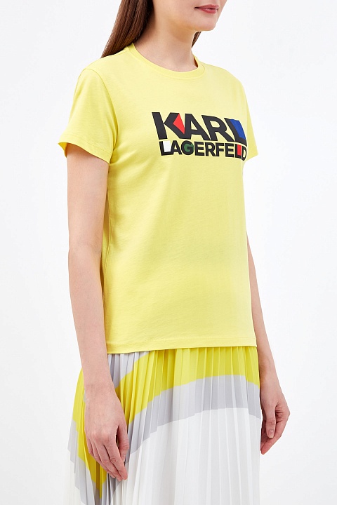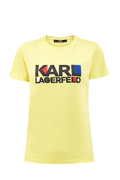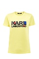 Базовая футболка из хлопка джерси от Karl Lagerfeld. Модель выполнена в пастельном желтом оттенке и украшена ярким блочным логотипом бренда в стиле баухаус. Классический крой с короткими рукавами и слегка облегающей посадкой делает модель максимально универсальной.