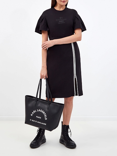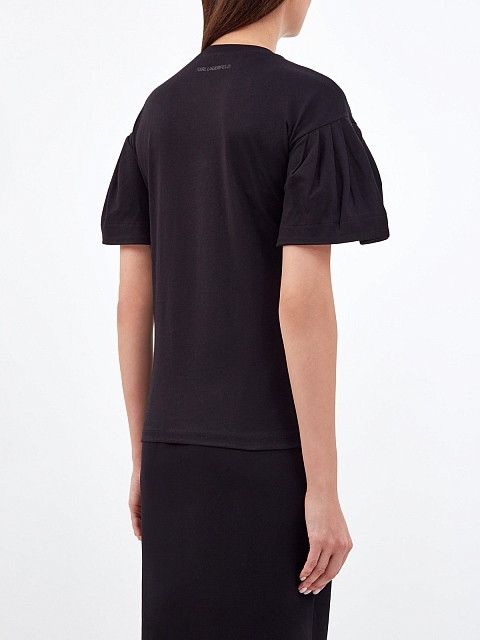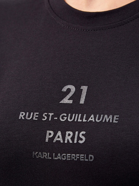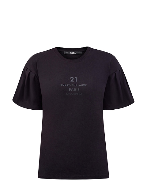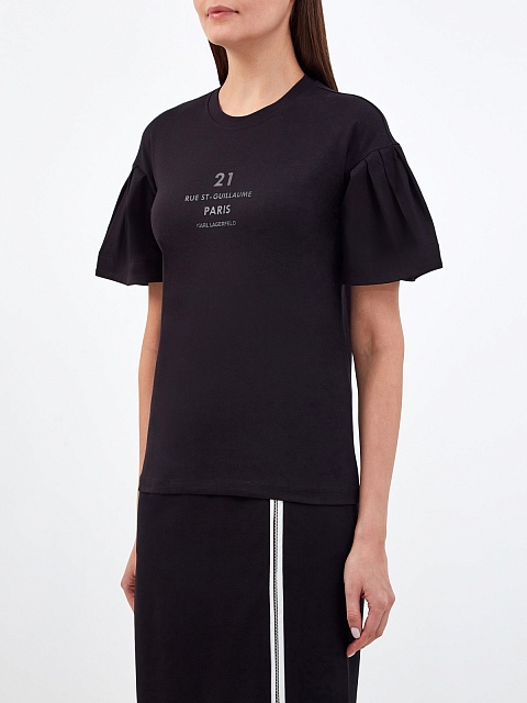 Элегантная женская футболка в расслабленном стиле от Karl Lagerfeld выполнена в фирменном черном цвете. Модель из дышащего хлопкового джерси станет идеальной основой для создания повседневных образов. Архитектурные рукава-воланы и фактурная аппликация Rue St-Guillaume придают изделию неформальный штрих. Детали: круглый вырез горловины, спущенный плечевой шов.