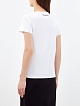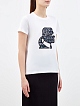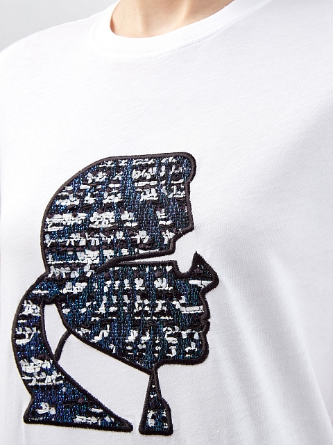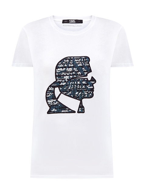 Стильная футболка от Karl Lagerfeld выполнена из натурального хлопкового джерси в базовом белом цвете. Дышащая ткань делает любой повседневный образ максимально комфортным, прямой крой не стесняет движений. Особенностью модели стала фактурная аппликация из букле с профилем Karl на передней планке. Детали: короткие рукава, круглый вырез горловины.