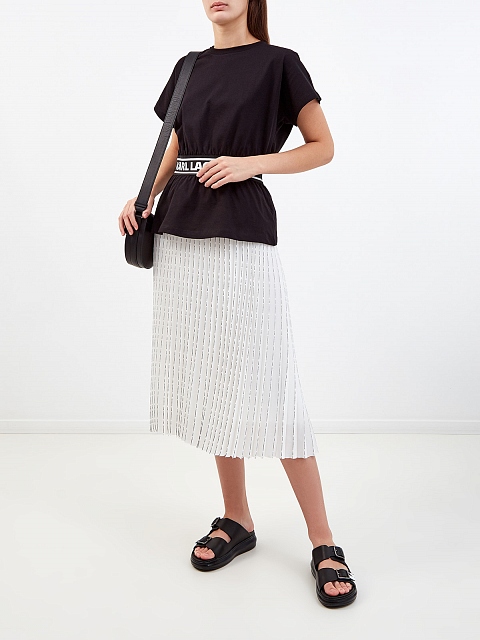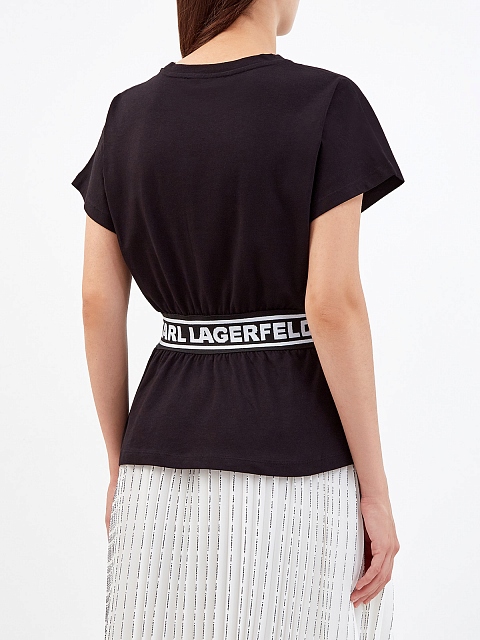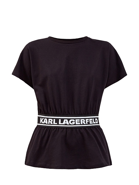 Базовая футболка от Karl Lagerfeld создана из хлопкового джерси. Монохромное изделие дополнено ярким акцентом — эластичной вставкой из фирменной тесьмы с принтом, которая подчеркивает линию талии. Расслабленный крой с цельнокроеными рукавами и круглым вырезом не стесняет движений, а полностью натуральный состав обеспечивает максимальный комфорт.