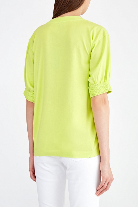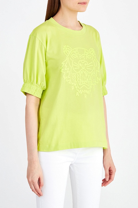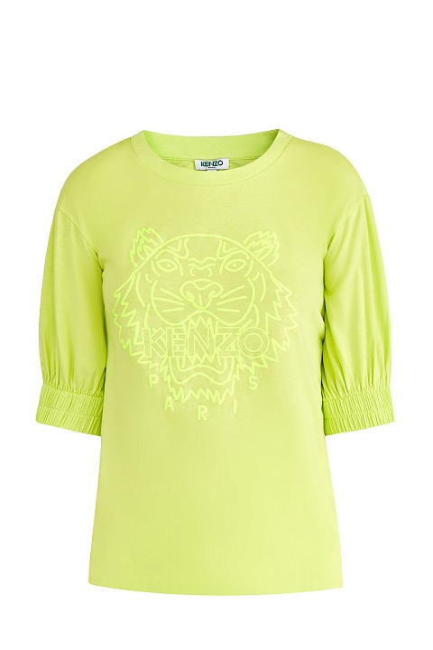 Базовая футболка от Kenzo выполнена из хлопкового джерси в неоново-желтом оттенке с гладкой фактурой. Благодаря мерсеризации материал устойчив к образованию складок. Передняя планка декорирована вышитым нитью в тон макро-логотипом бренда, эффектный образ создают пышные рукава с эластичной отделкой кромок. Круглая пройма горловины завершает дизайн.