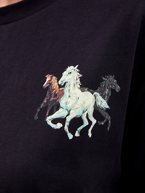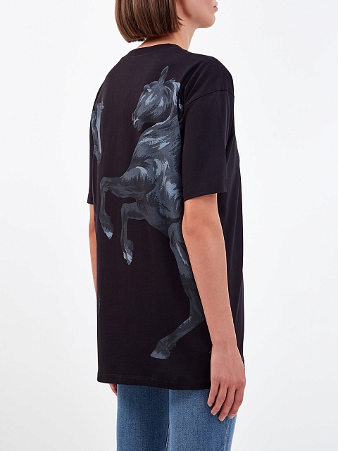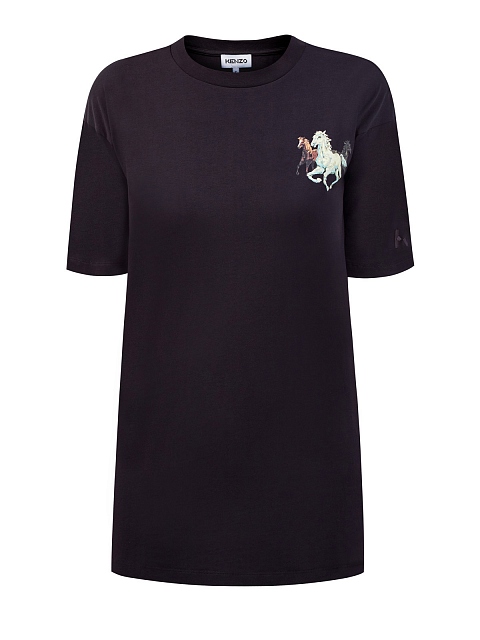 Стильная футболка-oversize от Kenzo выполнена из натурального хлопкового джерси в базовом черном цвете. Дышащая ткань делает любой повседневный образ максимально комфортным, свободный крой не стесняет движений. Особенностью модели стал архивный принт Chevaux на передней планке и спинке изделия. Детали: короткие рукава, круглый вырез горловины.