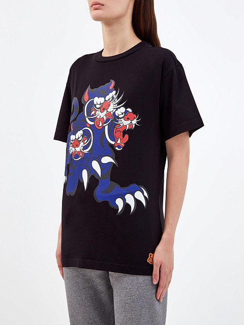 Женская футболка из эксклюзивной коллекции KENZO x KANSAIYAMAMOTO от Kenzo. Модель в черном цвете создана из дышащего хлопкового джерси, полностью натуральный состав идеально подходит для летнего сезона. Яркий макро-принт Three Tigers подчеркивает эффектный стиль изделия. Детали: рукава-реглан, круглый вырез горловины.