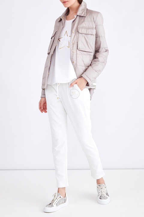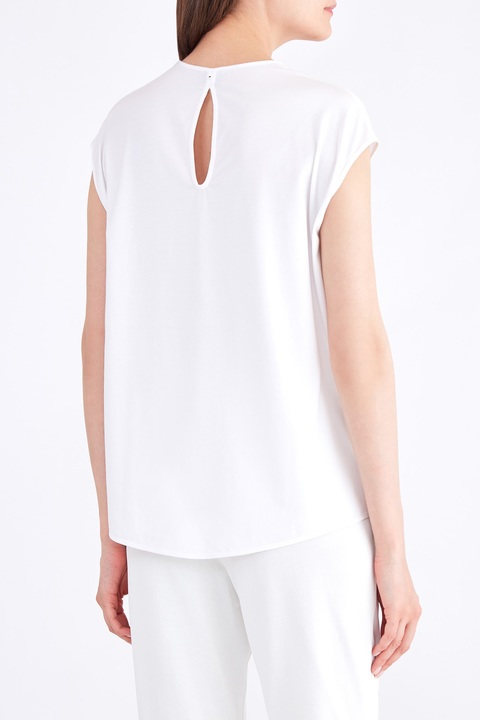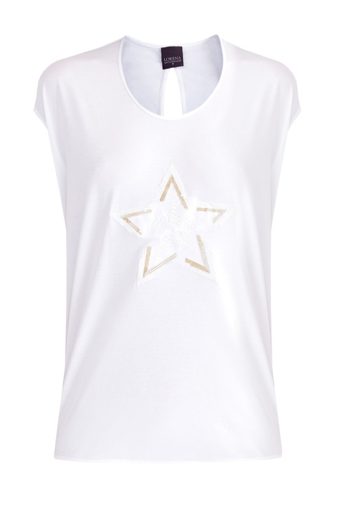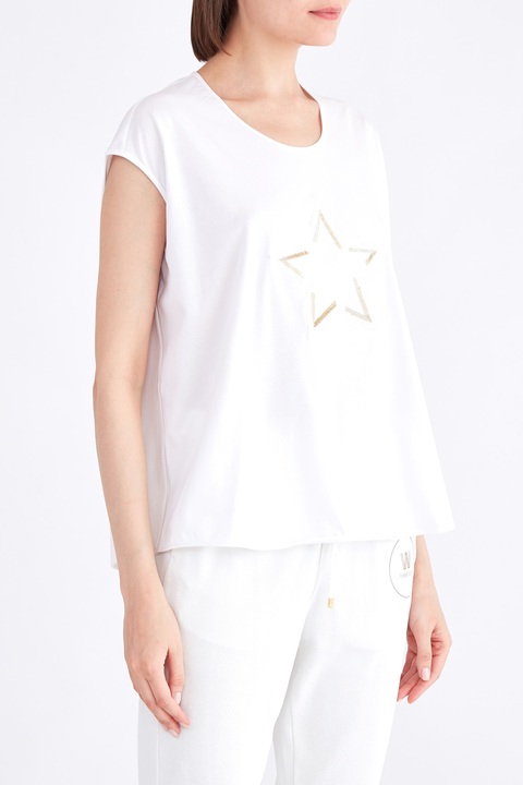 Лаконичная женская футболка Lorena Antoniazzi трапециевидного кроя, созданная из хлопкового джерси белого цвета. Модель с глубоким округлым вырезом горловины и цельнокроенными рукавами, украшена вышивкой в виде фирменного символа бренда — звезды из пайеток и нитей в тон. Образ завершает вырез-капелька на спинке. Сделано в Италии.