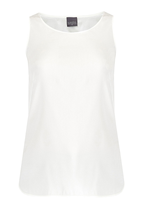 Базовый топ свободного кроя от Lorena Antoniazzi создан из чистого шелка в классическом белом цвете с благородным жемчужным блеском по поверхности. Фирменный стиль подчеркивает миниатюрная деталь в виде звезды на спинке. Детали: асимметричные нижние кромки, широкие бретели, вытачки для посадки по фигуре. Сделано в Италии.