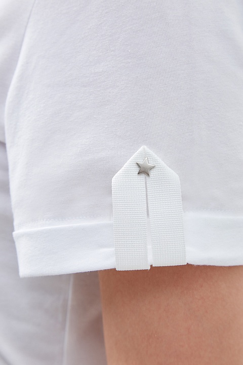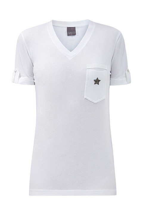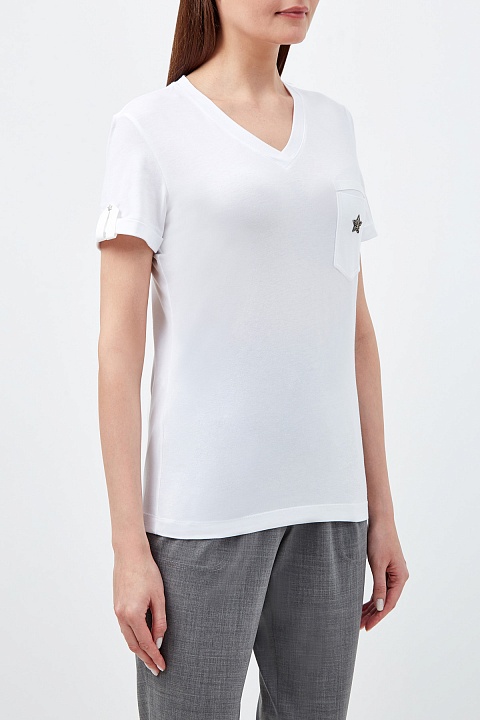 Базовая футболка с V-образным вырезом от Lorena Antoniazzi выполнена из мягкого хлопкового джерси. Сверкающий акцент вносит отделка из кристаллов Swarovski на кармане, а аппликация на спинке стилизована под надписи с изнаночной стороны изделий и придает образу нотку небрежности. Детали: короткие рукава с отворотами и фирменными заклепками, свободный силуэт. Сделано в Италии.