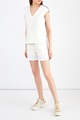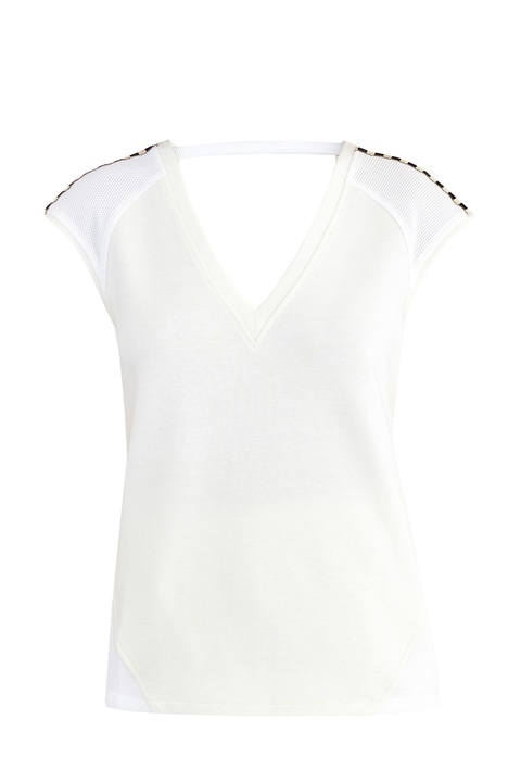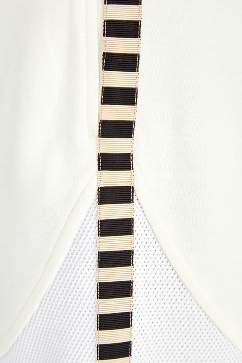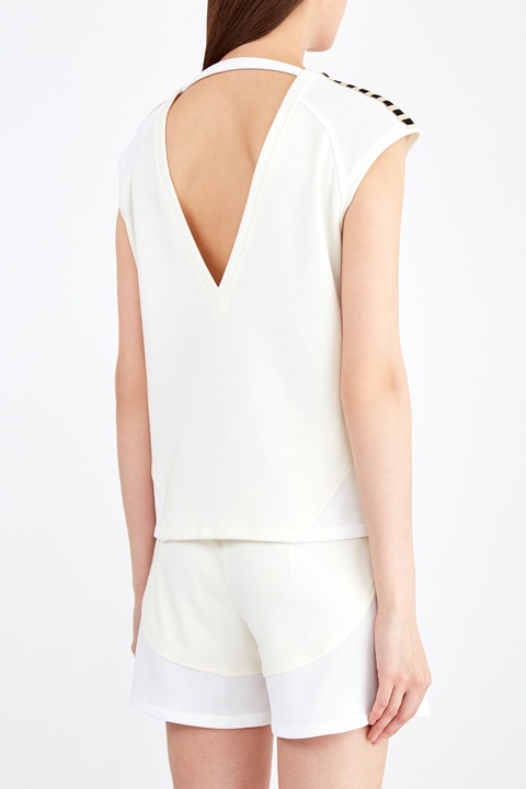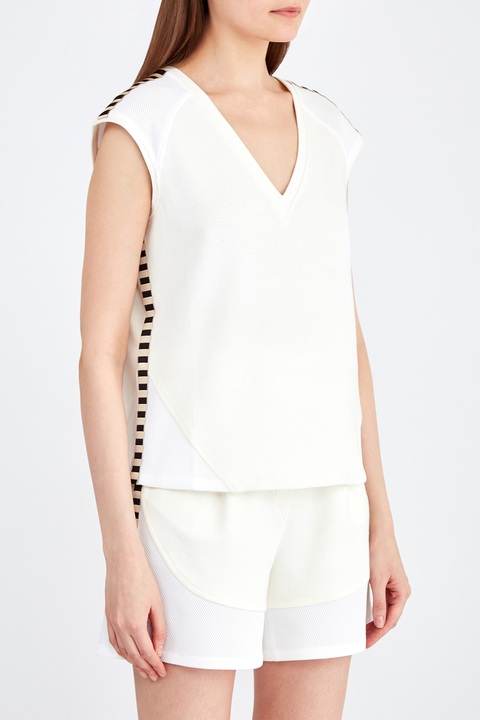 Топ в спортивном стиле от Maison Ullens выполнен из комфортной хлопковой ткани с добавлением волокон кашемира и вставками с перфорированной поверхностью. Аутентичный образ создают лампасы из репсовой ленты с узором в полоску на боковых швах. Особенностью модели стал крой с V-образной проймой горловины и декольтированной спинкой, комфорт в движении обеспечивает фиксирующая лента. Сделано в Италии.
