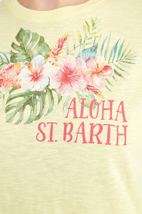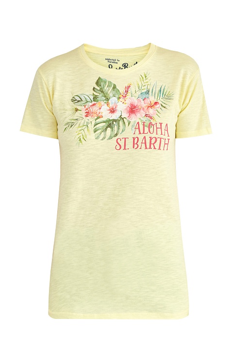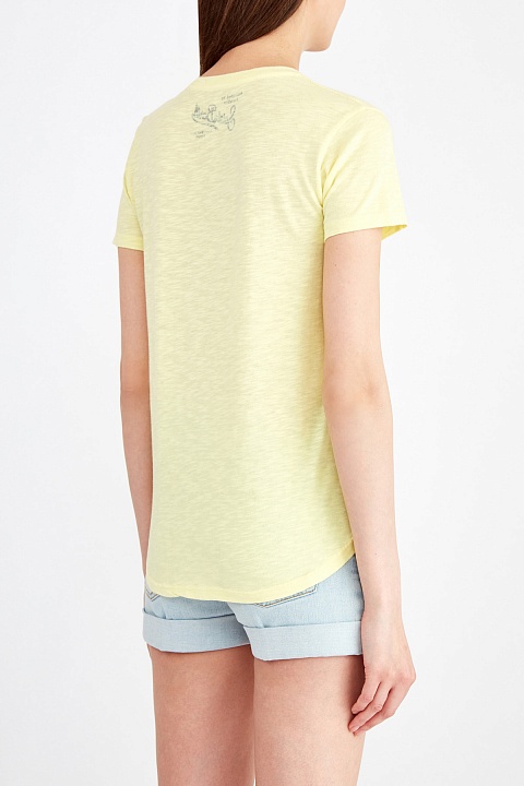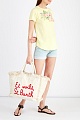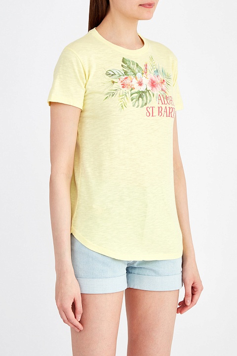 Футболка кроя по фигуре от MC2 Saint Barth выполнена в мягком лимонном оттенке из хлопкового джерси с неоднородной меланжевой фактурой. Передняя планка декорирована аппликацией, посвященной тематике путешествий. Образ в расслабленном стиле создают закругленные нижние края. Детали: круглая пройма горловины, кромки рукавов закрыты объемным швом двойной иглой.
