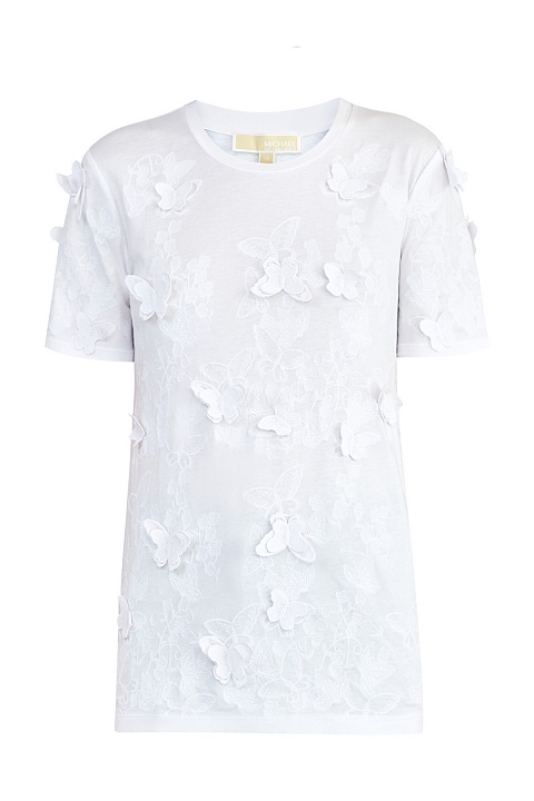 Базовая женская футболка от Michael Kors полностью выполнена из хлопкового джерси. Нейтральный белый цвет делает модель универсальным элементом гардероба, а вышитый цветочный узор с объемным кружевным декором подчеркивает присущее бренду романтическое настроение. Детали: свободный крой, круглая форма горловины.