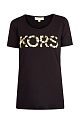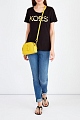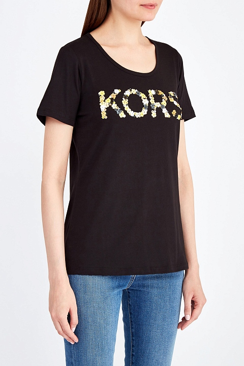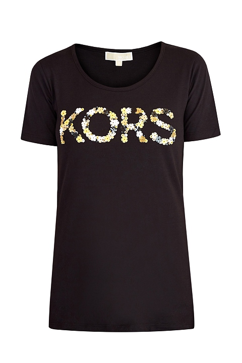Лаконичная футболка свободного кроя от MICHAEL Michael Kors выполнена из тонкого хлопкового джерси в универсальном черном цвете. Передняя планка модели украшена монограммой бренда, вручную расшитой пайетками. Изделие дополнено круглой проймой горловины, кромки закрыты объемным швом двойной иглой.
