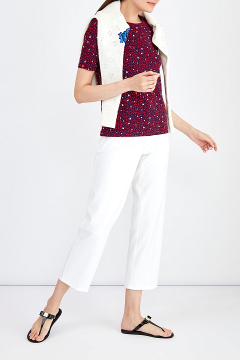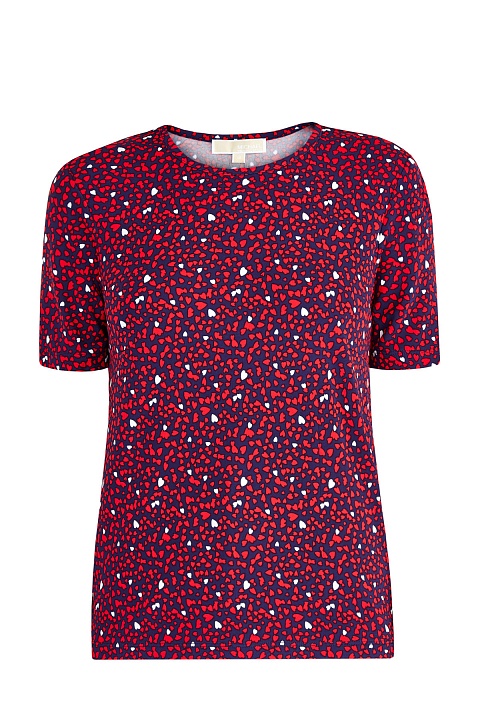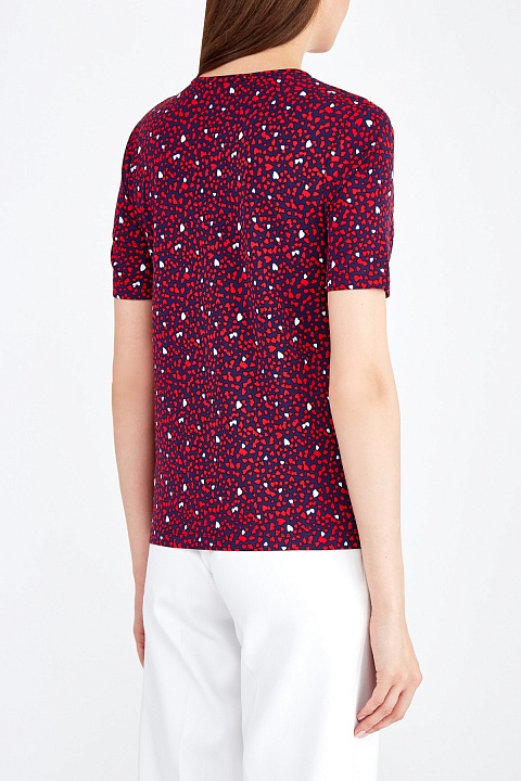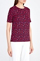 Яркая футболка свободного кроя от MICHAEL Michael Kors выполнена из матового и эластичного джерси. Нейтральный чернильно-синий фон подчеркивает микро-принт в алых и белых тонах. Изделие дополнено круглой проймой горловины, кромки закрыты объемным швом двойной иглой.