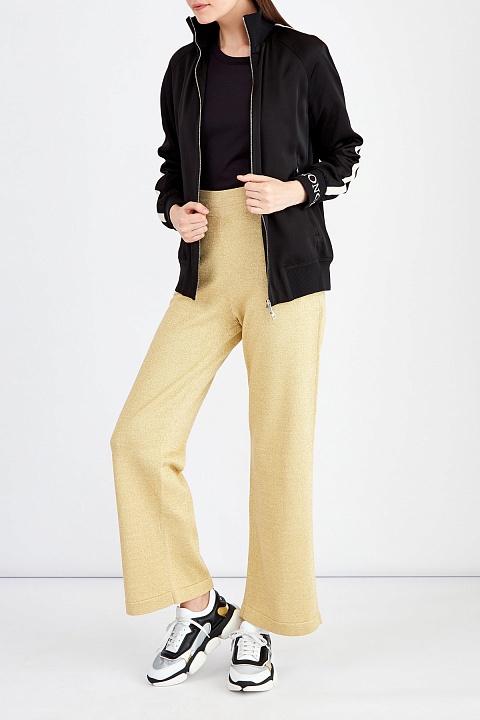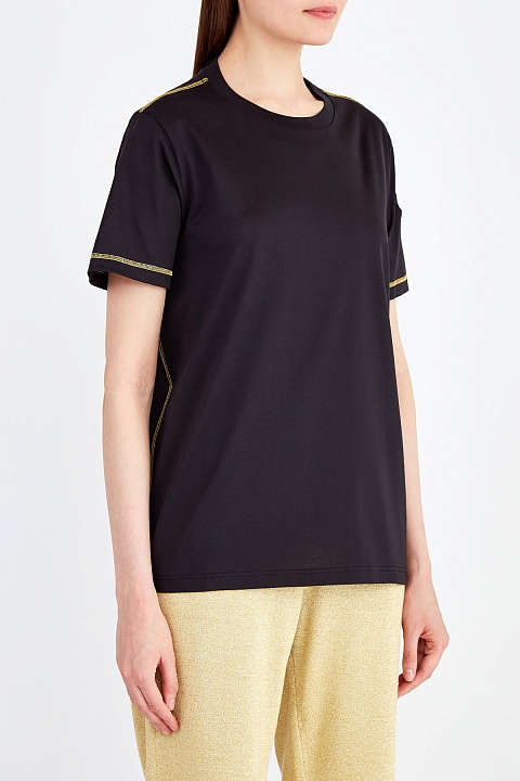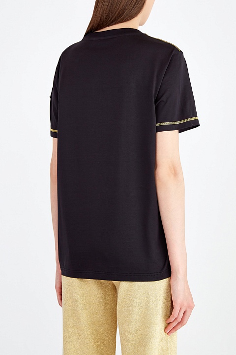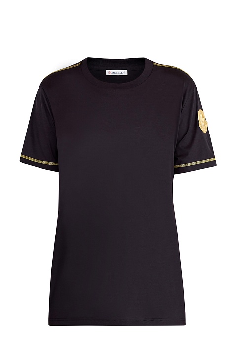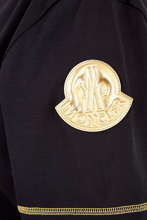 Футболка в спортивном стиле от Moncler выполнена из хлопкового джерси базового черного цвета. Яркий образ создают выполненные контрастной мерцающей нитью швы на наружной стороне и металлизированный золотистый логотип на плече. Детали: рукава и нижняя кромка оформлены объемным швом двойной иглой, круглая пройма горловины с эластичной окантовкой.