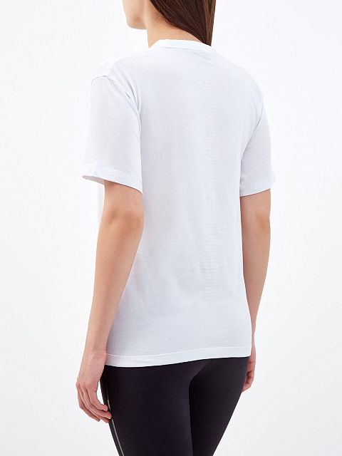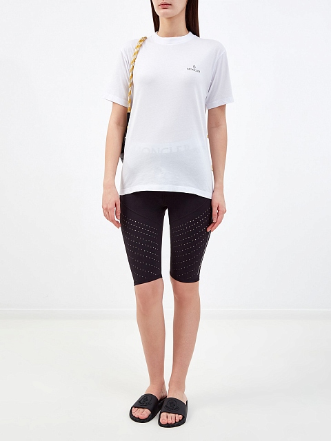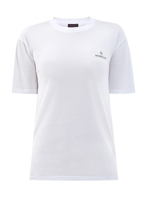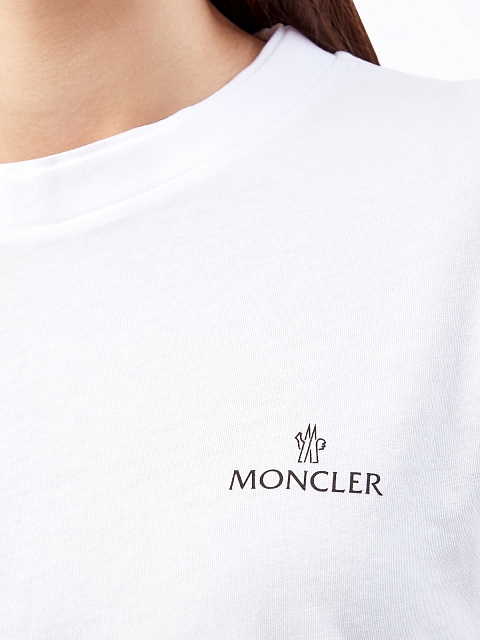 Базовая женская футболка от Moncler выполнена из хлопкового джерси в белом цвете. Свободный крой не стесняет движений, а полностью натуральный состав делает повседневные образы еще более комфортными. Фирменный штрих — минималистичный принт с логотипом бренда на передней планке. Детали: круглый вырез горловины, короткие рукава.