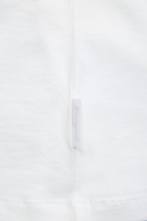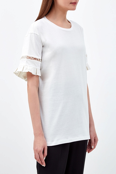 Базовая белая футболка в фирменном стиле Moncler. Особенностью модели стали короткие oversize-рукава с оборкой из объемной тафты и вставкой в виде монограммы бренда в технике макраме. Свободный крой не стесняет движений, а полностью натуральный состав делает повседневные образы еще более комфортными.