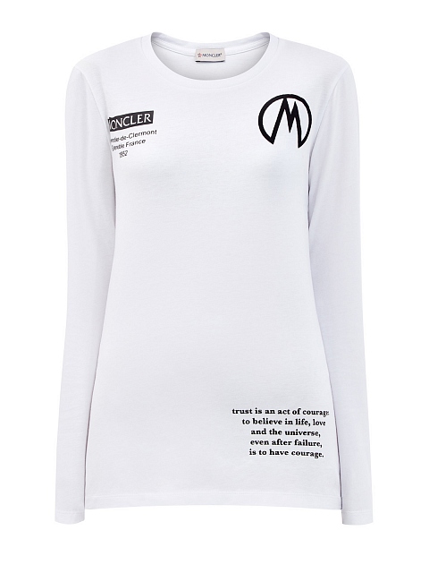 Стильный женский лонгслив из коллекции Grenoble от Moncler выполнен из хлопкового джерси в белоснежном оттенке. Динамичный акцент изделию придает контрастная фактурная аппликация с логотипом, принт-леттеринг отражает философию бренда. Полностью натуральный состав и свободный силуэт делают повседневные образы еще более комфортными. Детали: круглый вырез горловины, длинные рукава.