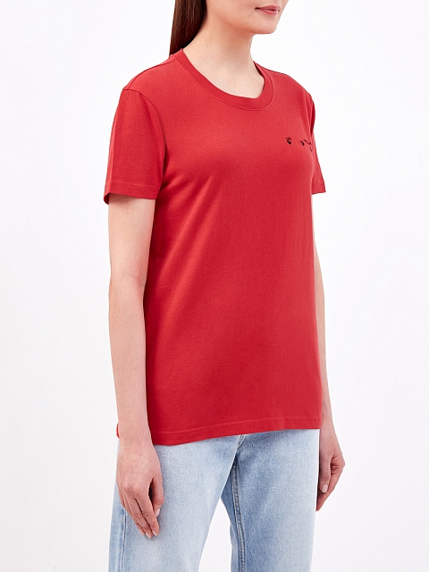 Яркая женская футболка от Off-White выполнена из легкого хлопкового джерси с гладкой поверхностью. Полностью натуральный состав обеспечивает максимальный комфорт, свободный крой не стесняет движений. Вышитая символика бренда подчеркивает расслабленный стиль изделия. Детали: короткие рукава, круглый вырез горловины.