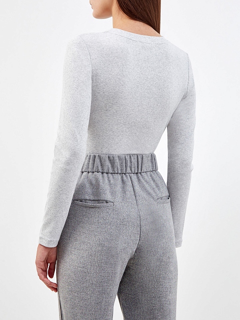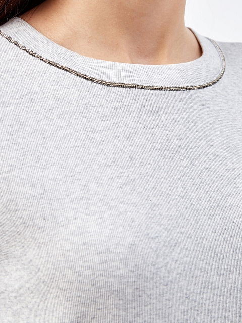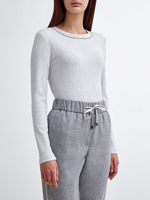 Лонгслив от Peserico выполнен из мягкого хлопка в меланжево-пепельном оттенке. Слегка приталенный крой и техника эластичной вязки делают модель универсальным элементом для создания повседневных образов. Изысканный штрих — вышивка мерцающими бусинами Punto Luce в трех цветах по вырезу горловины.