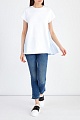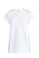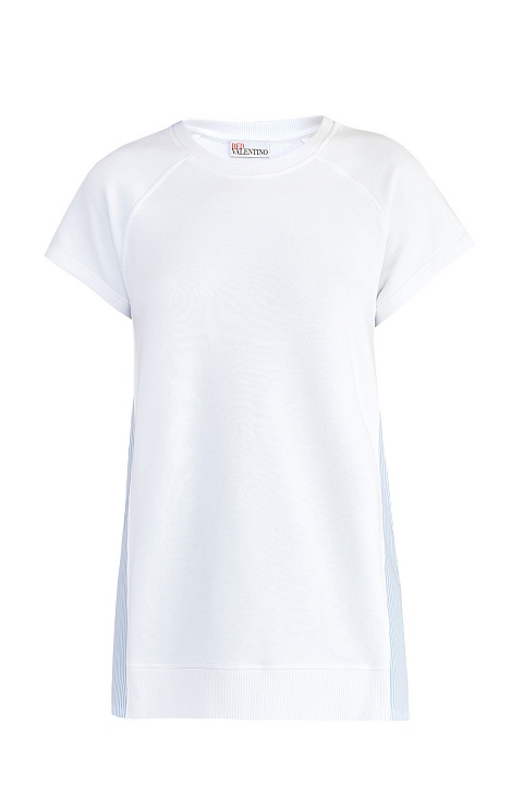Оригинальная футболка силуэта oversize от REDValentino выполнена из плотного хлопкового футера белоснежного цвета с фактурной внутренней поверхностью. Традиционная для толстовок и худи ткань дополнена вставками из тонкого поплина в полоску на боковых швах и подолом-баской с присборенной отделкой. Спортивный стиль изделия подчеркнут рукавами-реглан с вытачками для посадки по плечам, а также круглой проймой горловины.