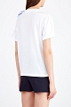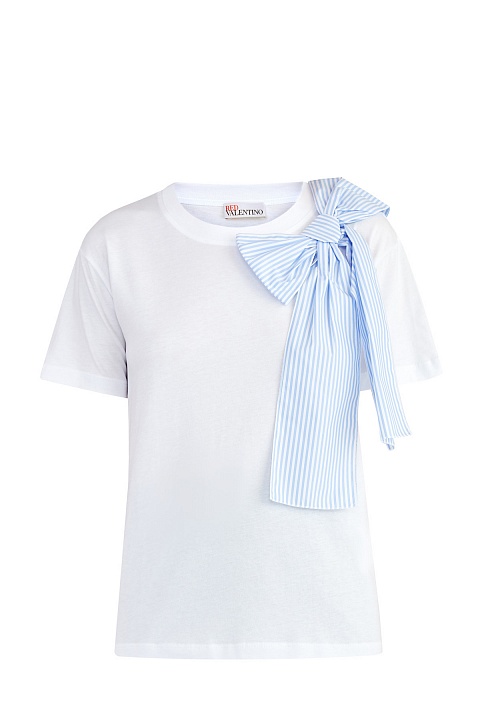 Эффектная женская футболка от REDValentino выполнена из дышащего хлопка базового белоснежного цвета. Особенностью модели стал декор передней планки нашивкой в виде объемного банта из хлопкового поплина с принтом в бело-голубую полоску. Круглый вырез горловины окантован эластичной тесьмой в рубчик, а кромки рукавов и нижний край закрыты швом двойной иглой.