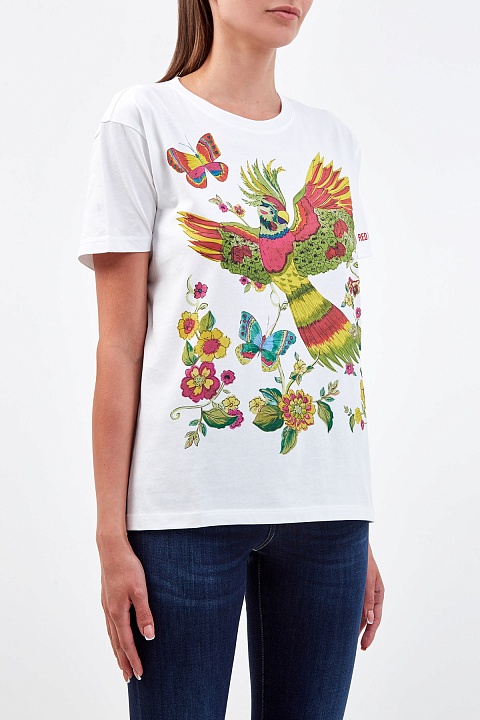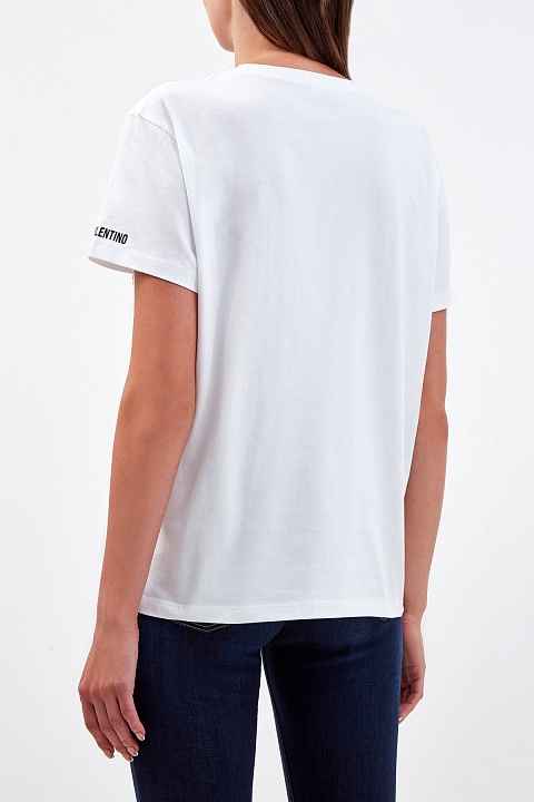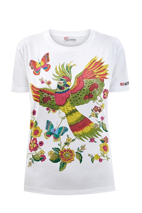 Легкая женская футболка от REDValentino выполнена из гладкого джерси в базовом белом цвете. Дышащий хлопковый материал идеально подходит для летнего сезона. Эксклюзивный принт Bird of Paradise in the Forest придает образу акцент в тропическом стиле. Модель свободного кроя дополнена логотипом с монограммой бренда. Детали: круглый вырез горловины, короткие рукава, прямой нижний край.