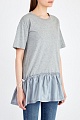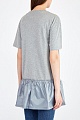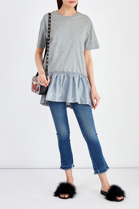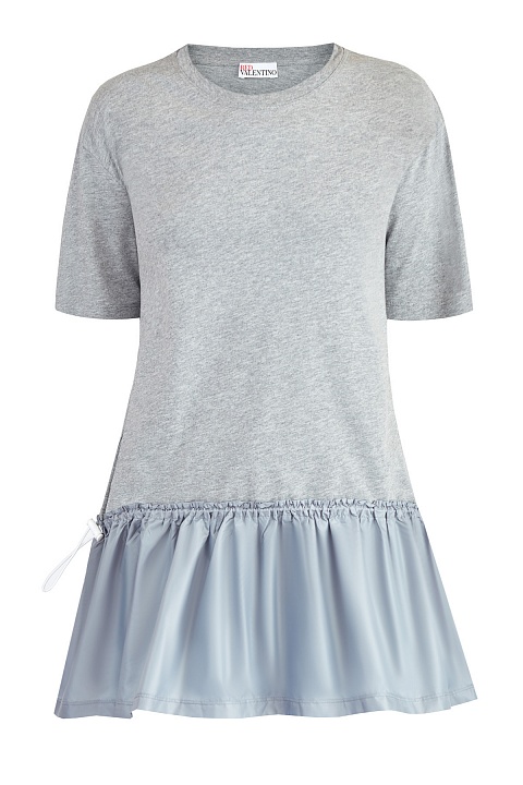 Удлиненная футболка силуэта oversize от REDValentino выполнена из тонкого и дышащего хлопкового джерси в меланжево-сером цвете. Оригинальный образ создает воздушный подол-баска на кулиске, созданный из тонкой нейлоновой ткани контрастного голубого оттенка. Детали: спущенная линия плеч, круглая пройма горловины окантована эластичной тесьмой, нижний край и кромки рукавов закрыты объемным швом двойной иглой.