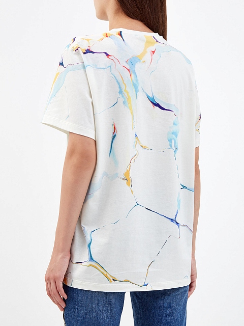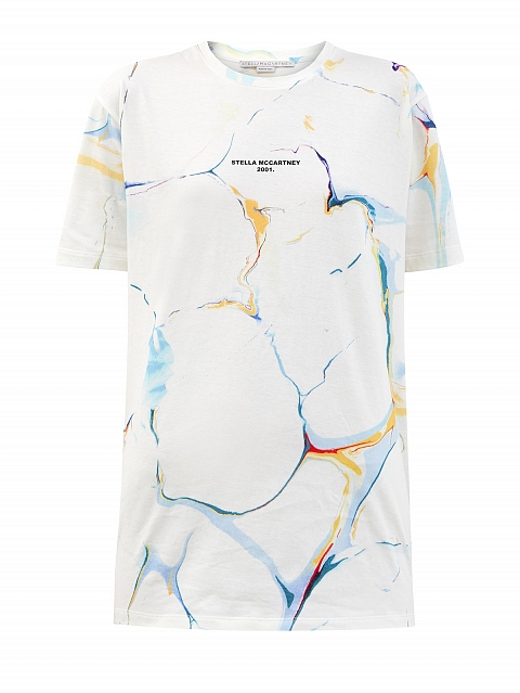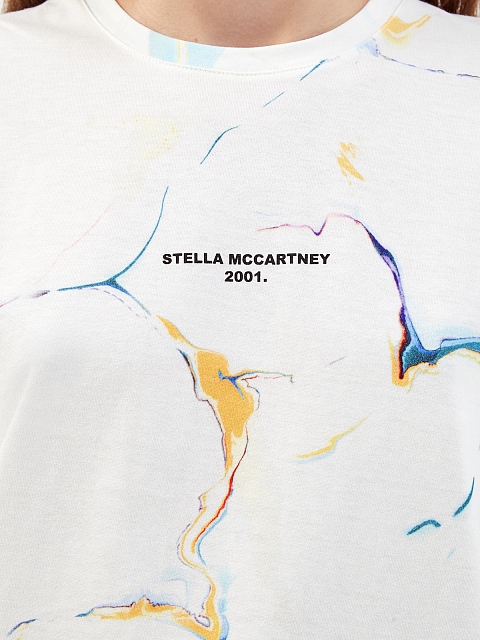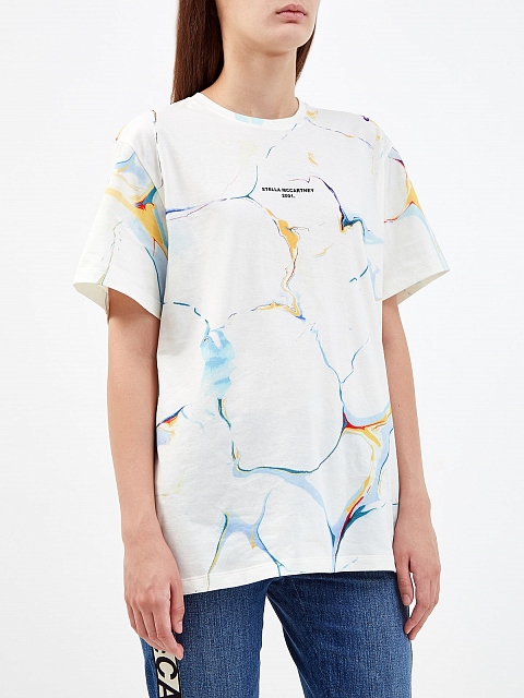 Базовая футболка-oversize от Stella McCartney. Для создания модели был выбран плотный хлопок джерси, производство которого не требует полива и сохраняет запасы пресной воды в рамках концепции осознанной моды. Изделие дополнено принтом с мраморным эффектом и градиентными переходами цвета. Детали: расслабленный крой, круглый вырез, короткие рукава.