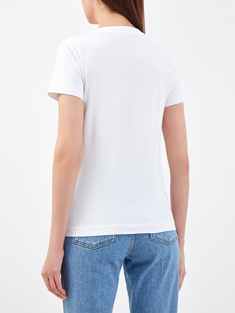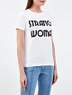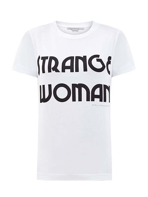 Базовая футболка от Stella McCartney выполнена из легкого и эластичного хлопкового джерси. Лаконичный белый цвет подчеркивает макро-принт «Strange Woman», нанесенный в технике термоаппликации. Свободный крой делает повседневные образы максимально комфортными. Детали: круглый вырез, короткие рукава.