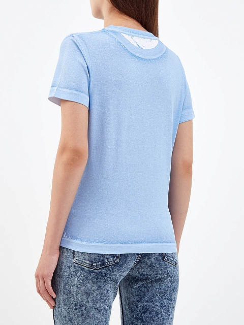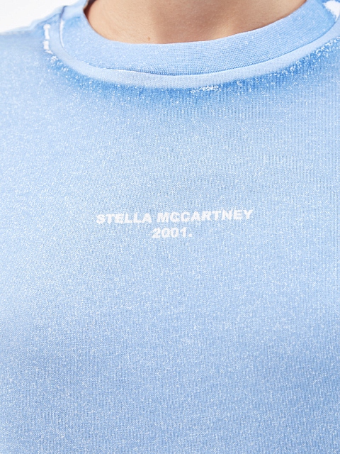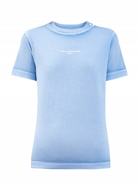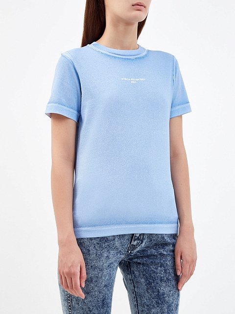 Базовая футболка от Stella McCartney — carry-over бренда. Модель выполнена из плотного хлопкового джерси и окрашена в готовом виде, что придает текстуре слегка неоднородный эффект с затемнением по швам. Фирменный штрих — логотип Модного дома в технике аппликации. Детали: круглый вырез, короткие рукава, свободный силуэт.