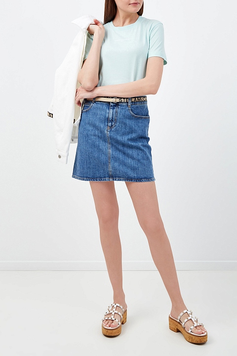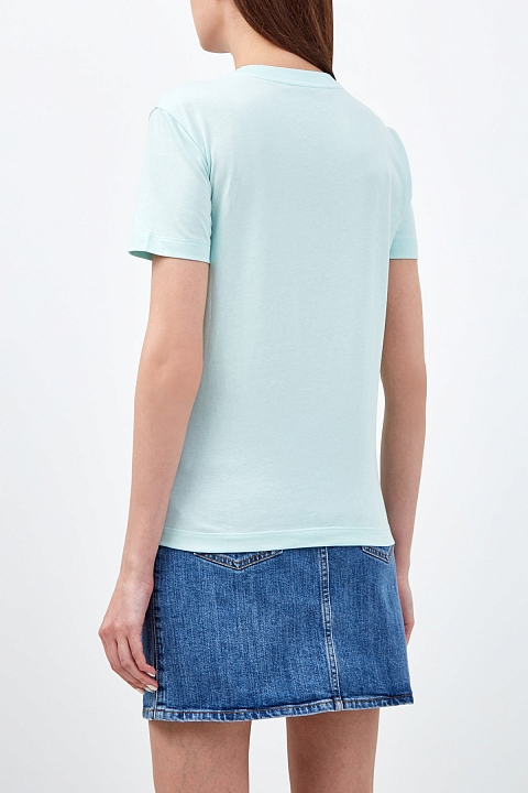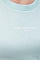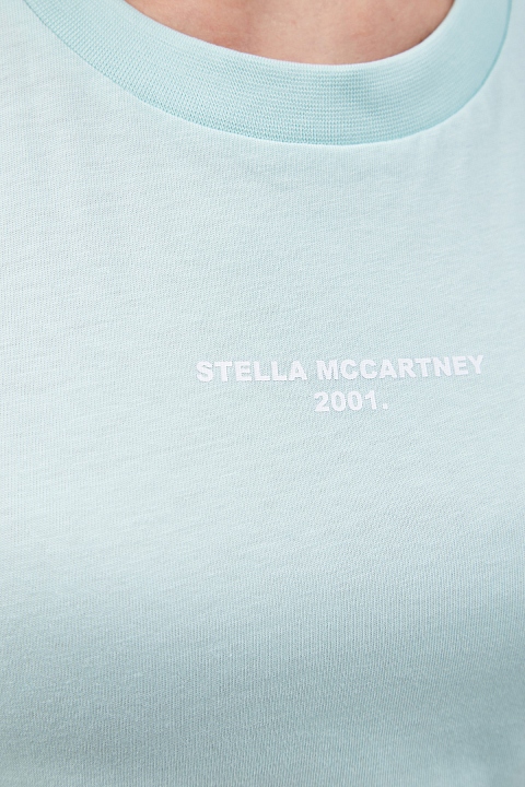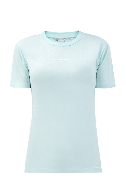 Базовая футболка от Stella McCartney выполнена из органического хлопка в рамках концепции осознанной моды — материал выращен в орошаемых дождями местах, что сохраняет запасы пресной воды. Изделие в пастельном оттенке ментола дополнено логотипом «Stella McCartney 2001». Детали: расслабленный силуэт, круглый вырез, короткие рукава.