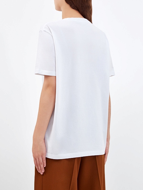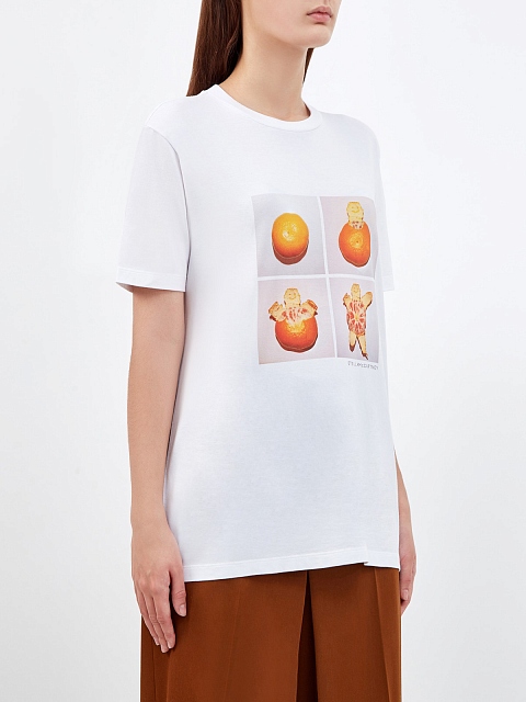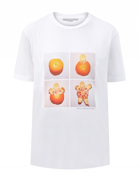 Базовая женская футболка Turtle Tangerine от Stella McCartney выполнена из органического хлопка, для выращивания которого требуется на 70% меньше воды. Модель со слегка облегающей посадкой делает любой повседневный образ максимально комфортным. Фото-принт вносит яркий акцент. Детали: круглый вырез, короткие рукава.