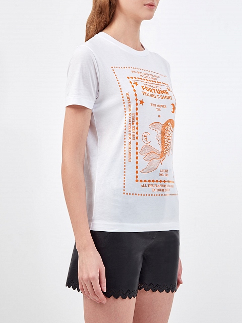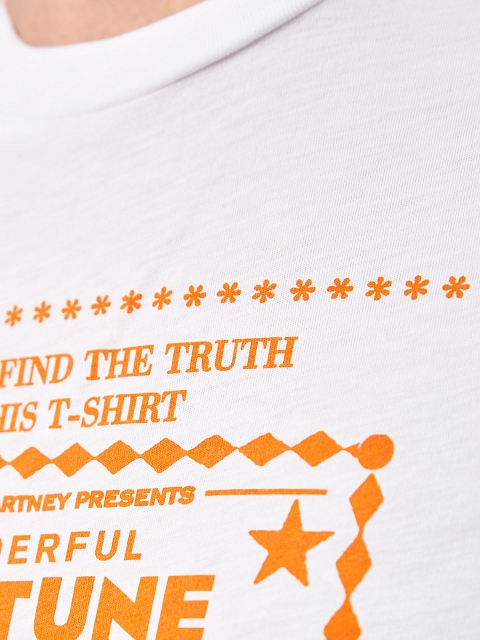 Базовая женская футболка от Stella McCartney выполнена из органического хлопка, для выращивания которого требуется на 70% меньше воды. Модель со слегка облегающей посадкой делает любой повседневный образ максимально комфортным. Яркий принт Fortune Cookie вдохновлен печеньем с предсказаниями. Детали: круглый вырез, короткие рукава.