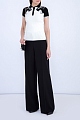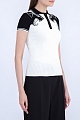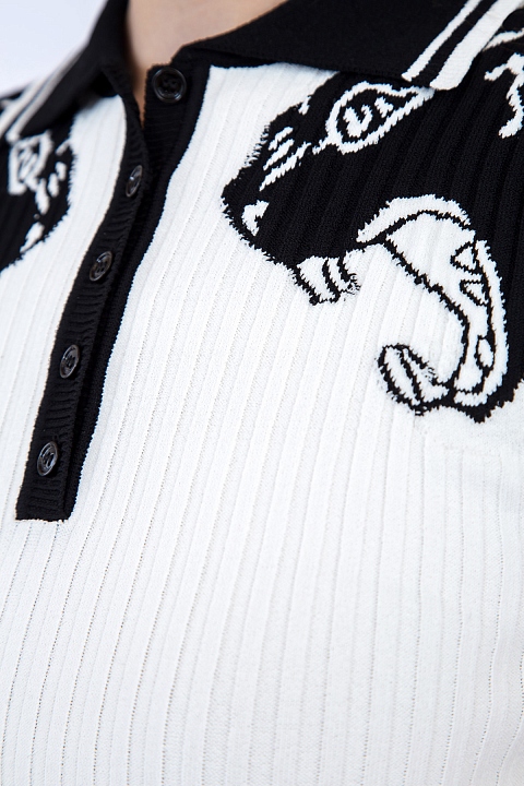 Легкое трикотажное поло Valentino облегающего кроя изготовлено английской вязкой из стрейч-вискозы с мотивом «Пантера» черно-белых цветов. Воротник модели дополнен планкой на пуговицах с фирменной символикой. Сделано в Италии.