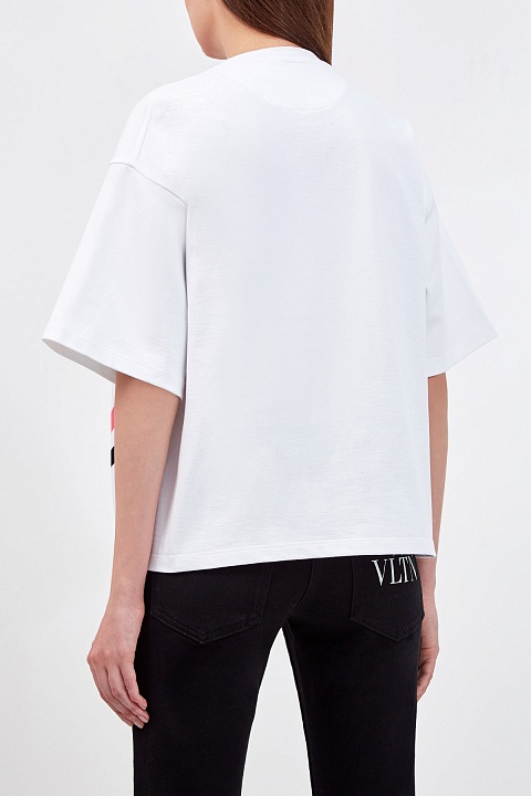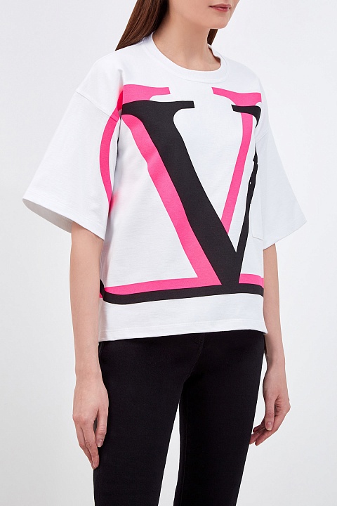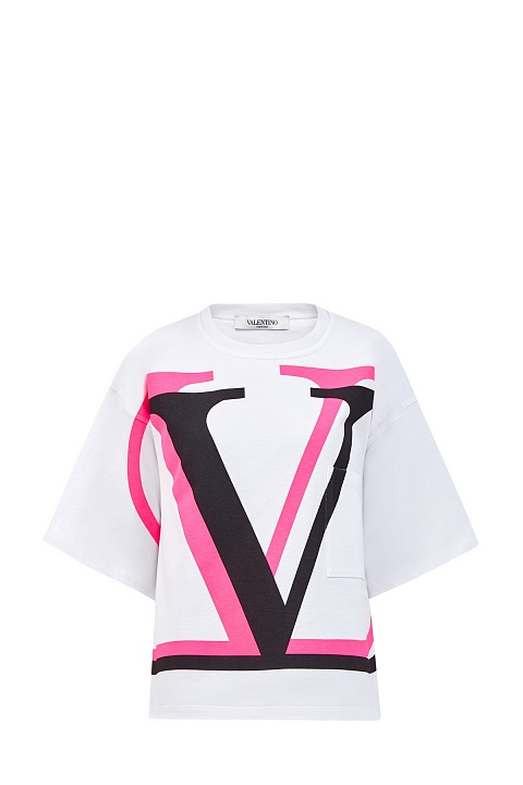 Базовая женская футболка кроя oversize от Valentino из плотного хлопка в универсальном белом цвете. Макро-аппликация VLOGO выполнена в знаковом для коллекции флуоресцентно-розовом оттенке и дополнена контрастной теневой отделкой. Изделие свободного силуэта с короткими рукавами и круглым вырезом горловины дополнено накладным карманом. Сделано в Италии.