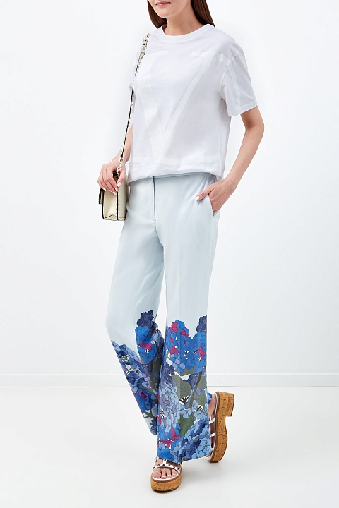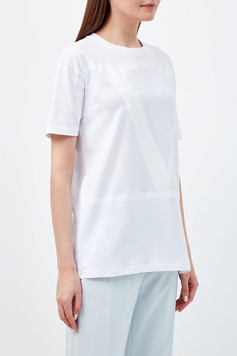 Базовая женская футболка кроя oversize от Valentino из мягкого хлопка в универсальном белом цвете. Макро-аппликация VLOGO выполнена в тон ткани и представлена как архивный логотип, интерпретированный в современном виде. Изделие чуть удлиненного силуэта с короткими рукавами и круглым вырезом горловины дополнит расслабленный повседневный образ. Сделано в Италии.