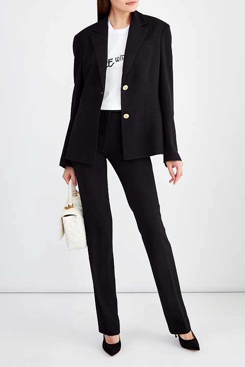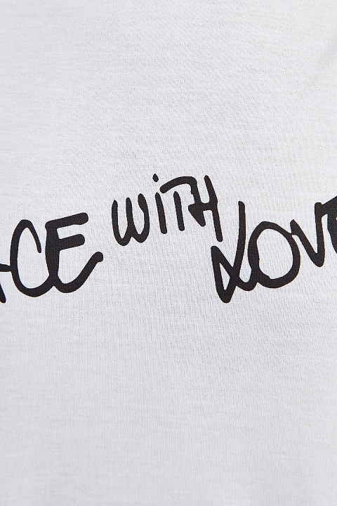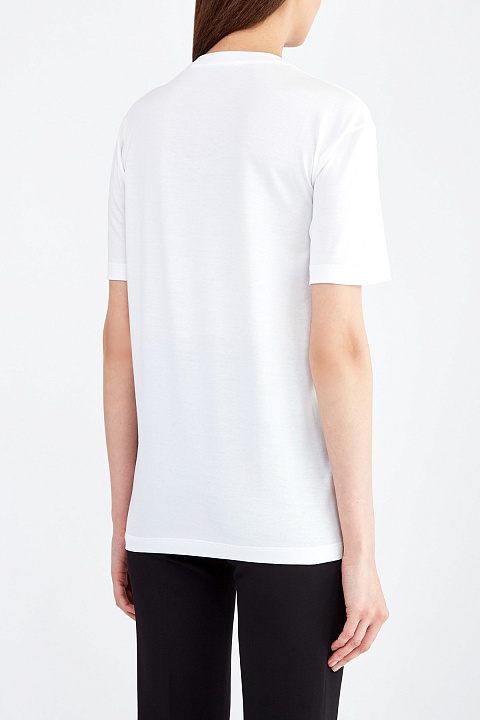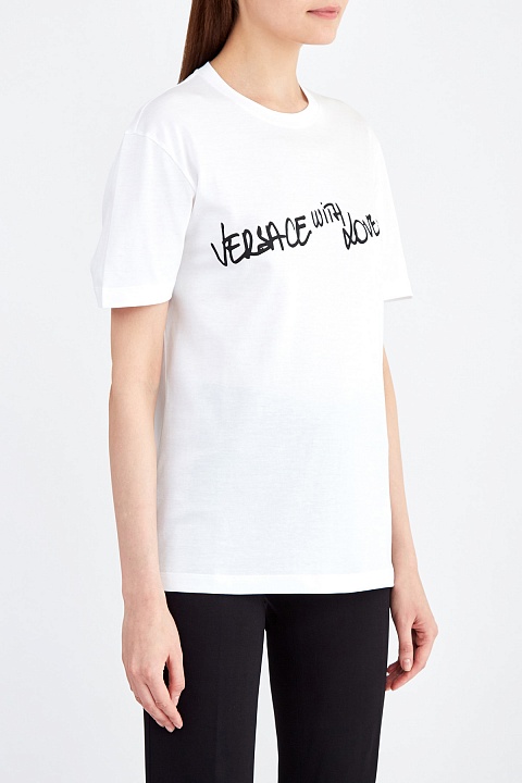 Базовая женская футболка от Versace полностью создана из органического хлопка в универсальном белом цвете. Модель украшена надписью «Versace With Love», выполненной рукой Донателлы Версаче и нанесенной в технике трафаретной печати. Детали: круглая пройма горловины, кромки рукавов и нижний край закрыты объемным швом двойной иглой. Сделано в Италии.
