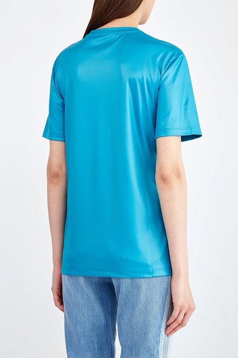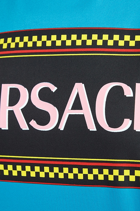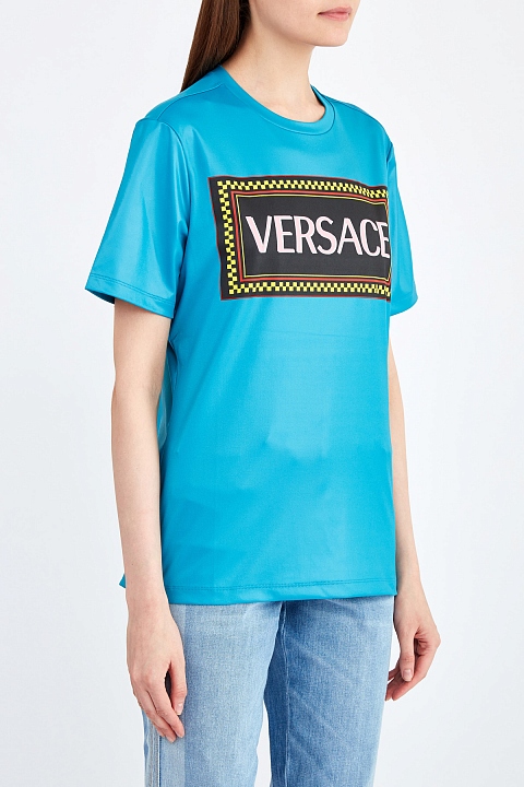 Яркая футболка от Versace выполнена в бирюзовом оттенке с полимерным напылением по всей поверхности, которое придает изделию легкий отражающий эффект. Передняя планка дополнена макро-логотипом «Versace 90s Vintage». Детали: круглая пройма горловины, кромки рукавов и нижний край закрыты объемным швом двойной иглой. Сделано в Италии.