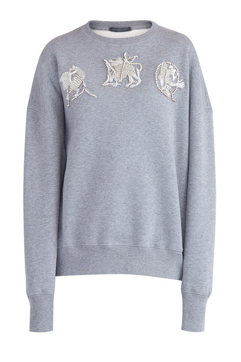 Стильная женская толстовка Alexander McQueen свободного расслабленного кроя с круглым воротом и длинными рукавами со спущенными линиями плеч. Модель выполнена из хлопковой фланели меланжевого серого цвета и украшена средневековыми аппликациями из серебристых бусин и бисера, ставшими лейтмотивом коллекции. Сделано в Италии.