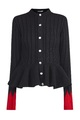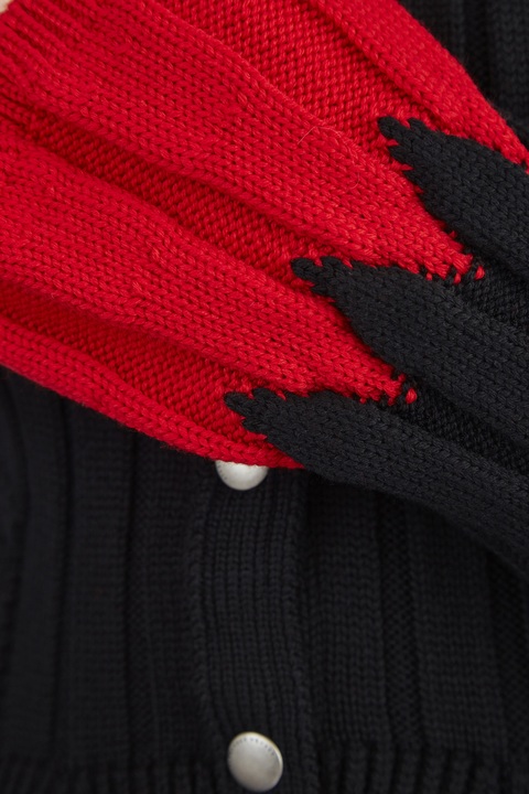 Кардиган приталенного кроя от Alexander McQueen выполнен в технике вязки в широкий рубчик из мягкой шерстяной пряжи глубокого черного цвета. Фирменный стиль подчеркнут контрастной отделкой расклешенных манжет в готическом стиле. Элегантный силуэт формирует баска по нижней кромке. Детали: застежка на кнопки, ворот-стойка. Сделано в Италии.