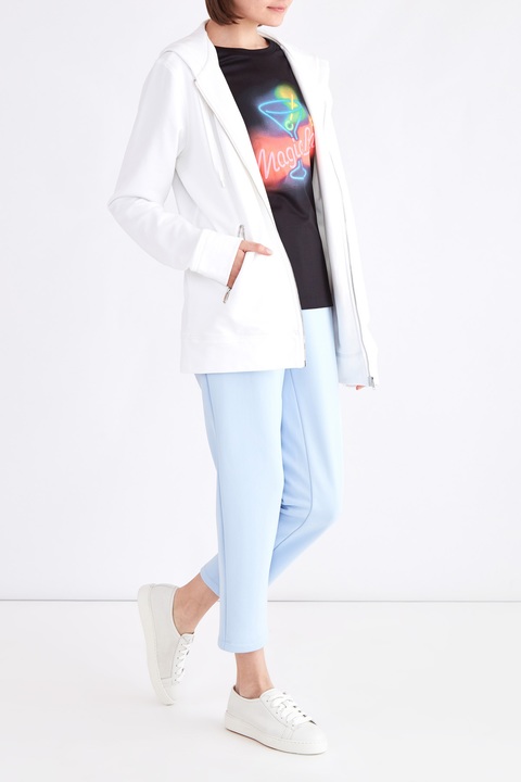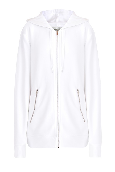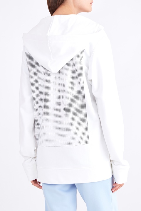 Комфортная женская толстовка из весенне-летней коллекции Alexander Terekhov выполнен из мягкого хлопка с добавлением эластичных волокон для комфортной посадки в лаконичном белом цвете. Модель с глубоким капюшоном на кулиске оснащена прорезными карманами и застежкой-молнией. Спинка изделия декорирована аппликацией в монохромном сером оттенке с портретом дизайнера, составленного из точек разного диаметра. Широкие эластичные манжеты на рукавах завершают образ в спортивном стиле. Сделано в России.