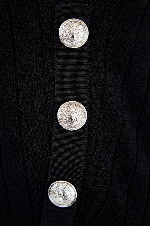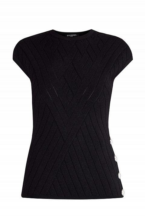 Лаконичный женский джемпер от Balmain выполнен из тонкой эластичной пряжи базового черного цвета. Гладкая фактура ткани подчеркивает вязаный узор с эффектом плетения и перфорацией. Модель с круглой проймой горловины и цельнокроеными короткими рукавами дополнена фирменными пуговицами с тисненым гербом на боковом шве.