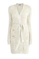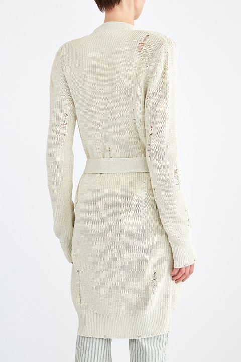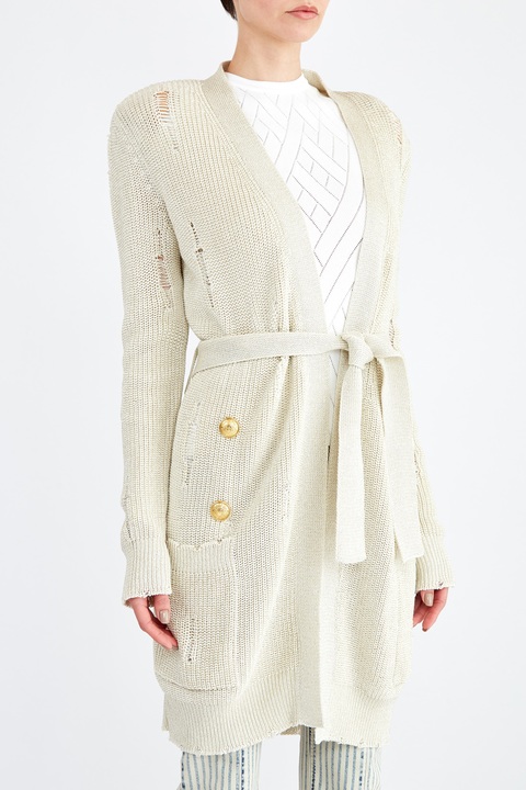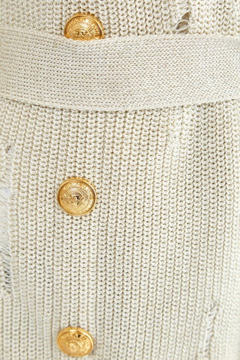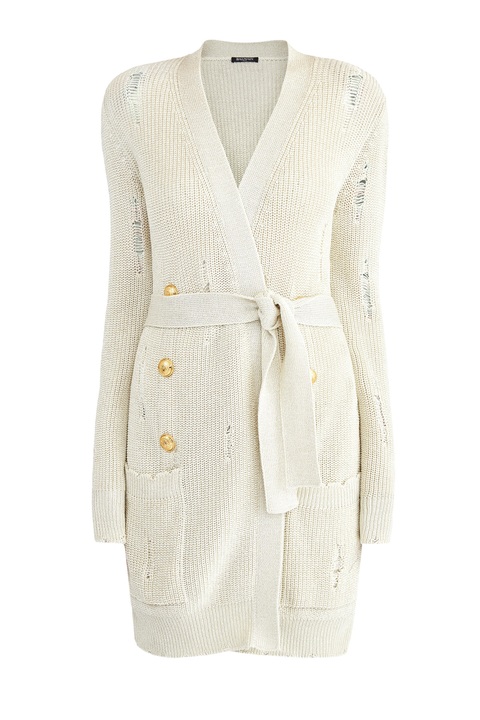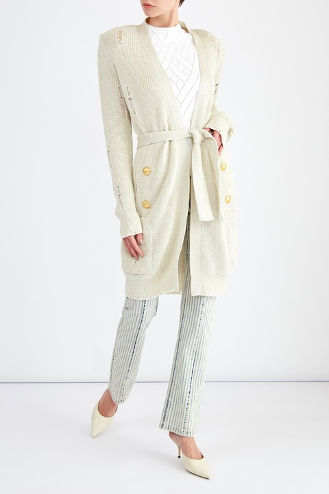 Эффектный удлиненный кардиган от Balmain выполнен в технике крупной вязки из хлопковой пряжи кремового оттенка с вплетенной нитью люрекса, которая придает фактуре нежное мерцание. Особенностью модели стал оригинальный дизайн с выраженным эффектом стиля деконструктивизм. Детали: планки дополнены декоративными рядами фирменных пуговиц, съемный широкий пояс, шалевый ворот.
