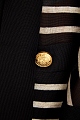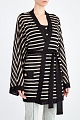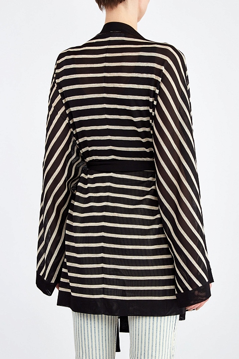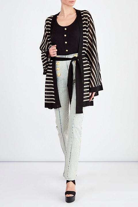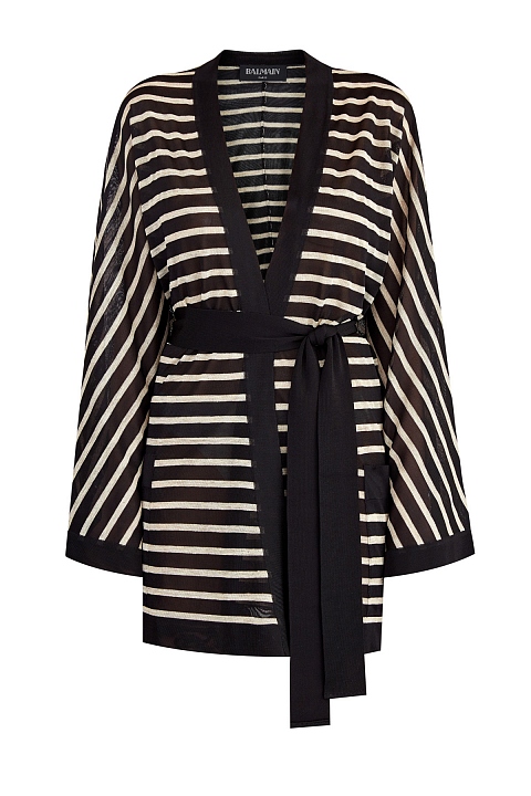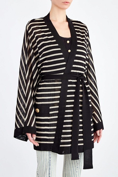 Воздушный женский кардиган от Balmain выполнен из тонкой пряжи с добавлением нити льна. Полупрозрачная гладкая фактура создает вуалевый эффект, а узор в полоску в кремово-черной гамме придает яркий акцент всему образу. Широкий пояс-лента, шалевый ворот и расклешенные цельнокроеные рукава заимствованы у традиционного кимоно. Детали: накладные карманы с фирменной отделкой, контрастная окантовка кромок.