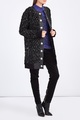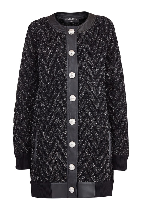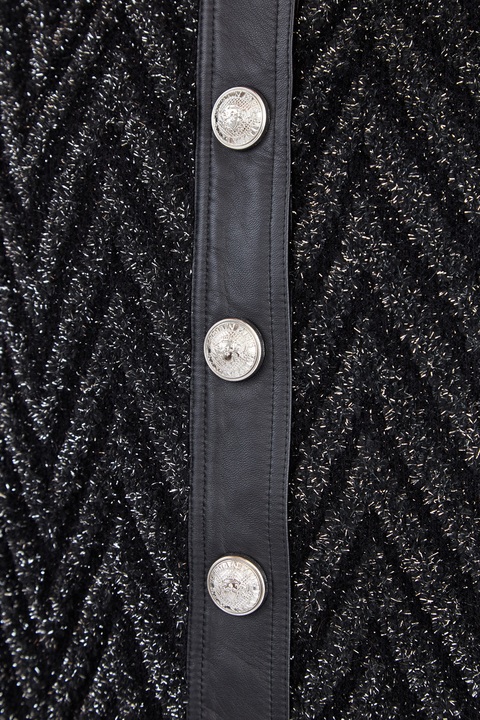 Фактурный женский кардиган удлиненного кроя из коллекции осень-зима от Balmain выполнен из вискозной пряжи с добавлением нити мерцающего люрекса в черно-серебряной гамме. Модель с узором в виде контрастных зигзагов дополнена элементами из овечьей кожи мелкозернистой выделки по круглой пройме горловины и линии застежки, которые образуют эффектный контраст текстур. Планки оснащены прорезными карманами на массивных застежках-молниях серебристого оттенка, а нижняя кромка и манжеты выполнены в технике английской резинки для посадки по фигуре. Слегка спущенная линия плеча и свободный силуэт формируют образ в стиле спортшик. Дизайн завершают пуговицы с тисненым изображением герба Модного дома.