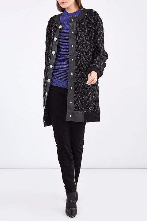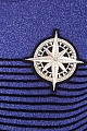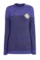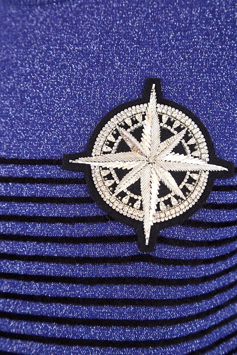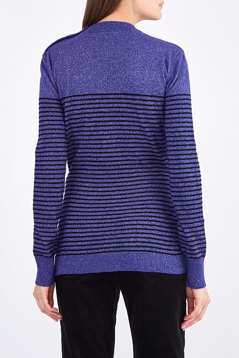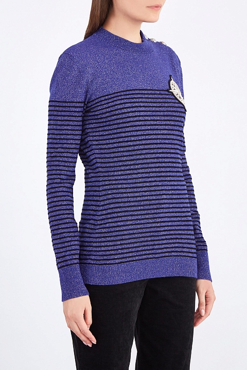 Яркий женский джемпер из коллекции осень-зима от Balmain создан из ценной кашемировой пряжи в технике плотной чулочной вязки в насыщенном васильковом оттенке с вплетенной нитью мерцающего люрекса. Синтетические волокна в составе позволяют изделию надолго сохранить первоначальные форму и глубокий оттенок. Модель декорирована узором в тонкую горизонтальную полоску черного цвета, а также дополнена фирменными пуговицами серебристого тона с фактурным гербом. Дизайн в морском стиле завершает аппликация в виде компаса с вышивкой кристаллами и стеклярусом в стальной гамме.