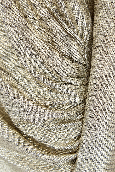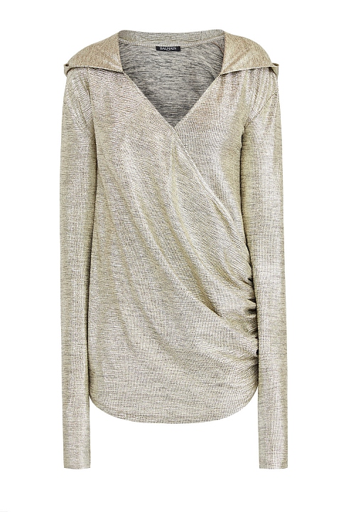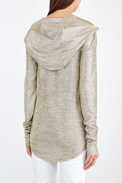 Трикотажный джемпер Balmain свободного силуэта с эффектом металлического ламинирования. Вырез cache-coeur формирует зону декольте, прямой крой завершен сборкой по левому краю изделия. Модель дополнена удлиненными рукавами и объемным капюшоном.
