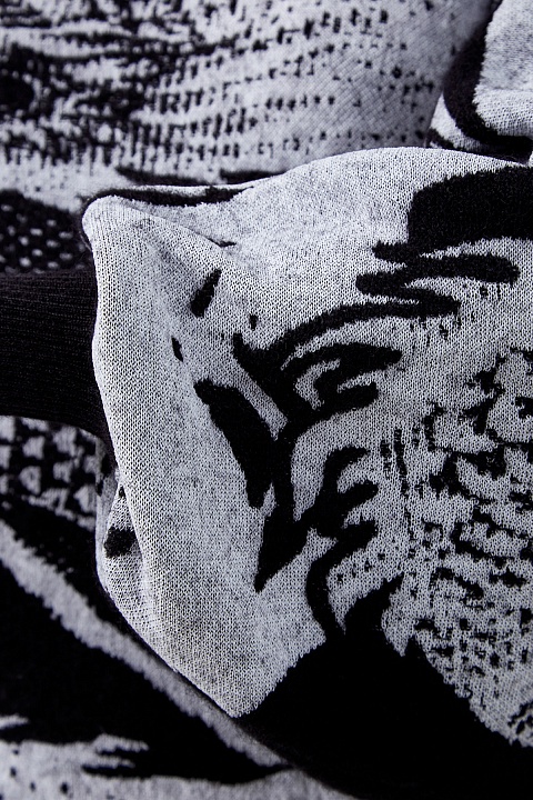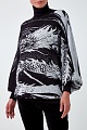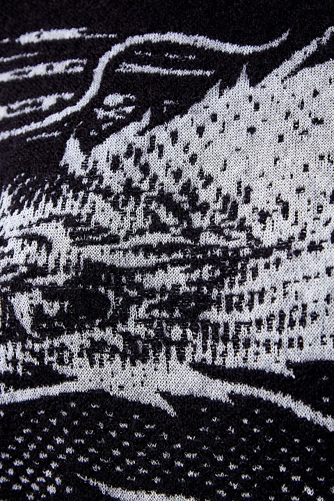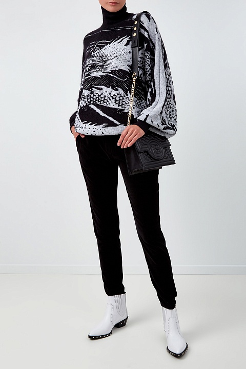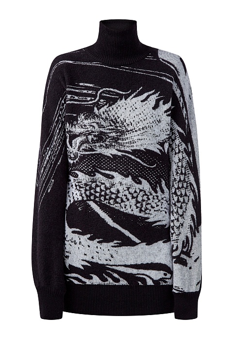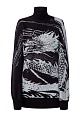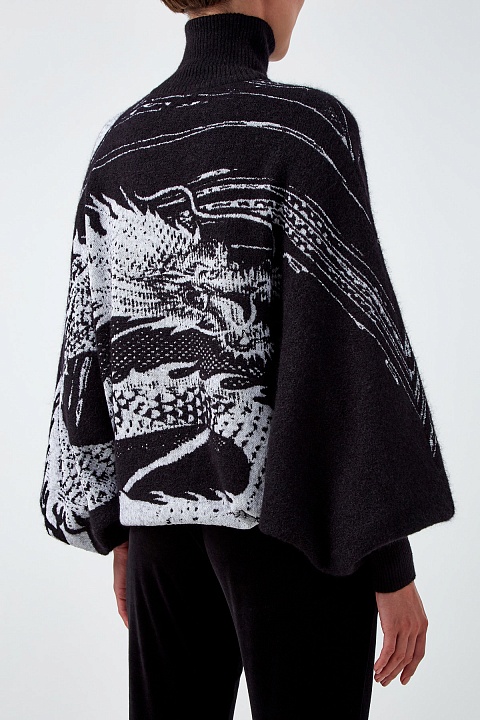 Объемный вязаный свитер от Balmain выполнен из пряжи на основе теплой нити мохера. Синтетические волокна в составе ткани надолго сохраняют первоначальную форму изделия. Вышитый принт в виде дракона был вдохновлен культурой Японии, а силуэт с пышными рукавами и высоким воротником заимствован у традиционного кимоно. Детали: высокие манжеты и нижний край в рубчик, слегка удлиненный силуэт.